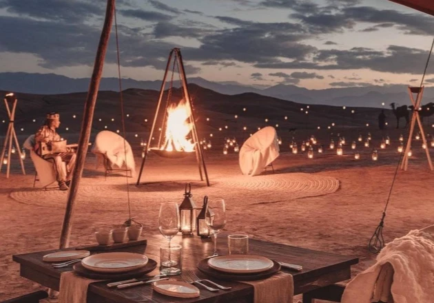 Day 2: AGDAZ-ZAGOURA- ERG CHIGAGAAfter breakfast, we drive to Tamgrout where a stop at the potteries famous for the green glaze and after the ancient Quranic library with exquisite hand-written Arabic. We will pass through many villages so that you can get a good idea of life in the oasis. Once we get to M’hamid, further south, at the gate to the Sahara where the paved road ends, we will stop for lunch at your leisure. In the evening, you will enjoy one to two hours camel ride leading into the heart of Sahara and to the highest Erg Chigaga dune to enjoy a mermorable sunset. You will enjoy a splendid dinner under the stars next to the campfire while entertained by local music then spend the night in your private tent enjoying the silence and the beauty of the dunes.